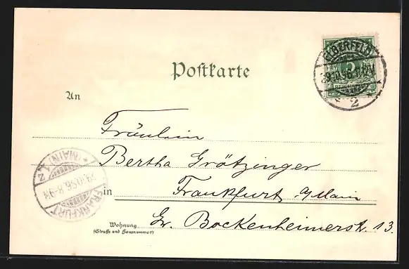 Personenbezogene Daten auf der Rückseite der Karte wurden durch blauen Textmarker unkenntlich gemacht. Die blauen Stellen sind auf die Vorderseite durchgeweicht und wirken sich negativ auf das Postkartenfoto aus
