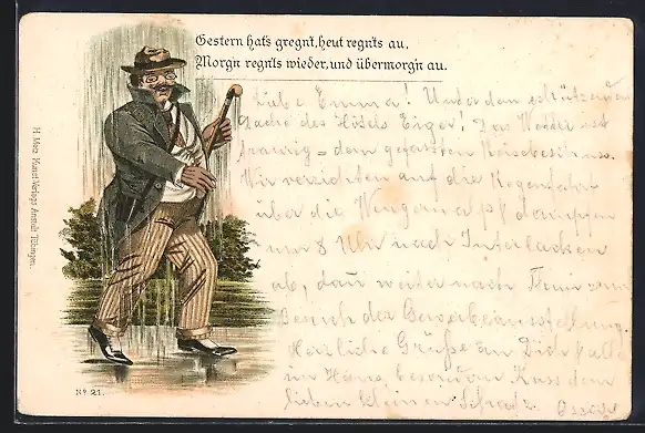Lithographie Eleganter Herr mit Spazierstock im Regen