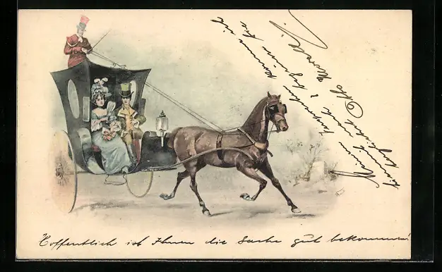 Lithographie Elegantes Paar in einer Pferdekutsche mit Kutscher