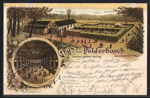 Lithographie Emmerich /Rh., Gasthaus Polderbusch, Gesamtansicht und Saal