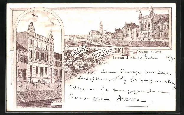 Lithographie Emmerich /Rh., Hotel Kaiserhof, Flusspartie mit Dampfer