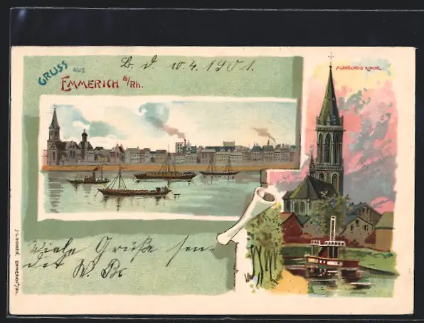 Lithographie Emmerich a. Rh., Aldegundis Kirche, Bootspartie