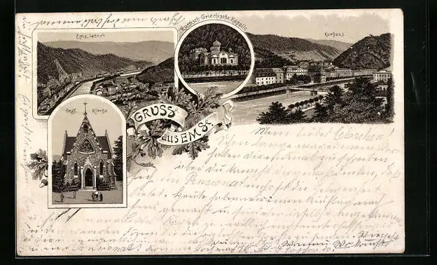 Lithographie Ems, Englische Kirche, Ortsansicht mit Ems