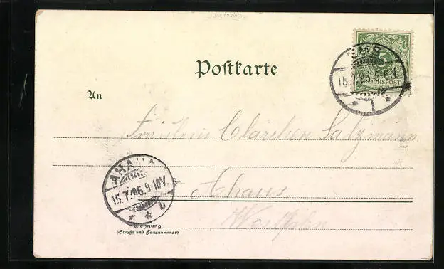 Personenbezogene Daten auf der Rückseite der Karte wurden durch blauen Textmarker unkenntlich gemacht. Die blauen Stellen sind auf die Vorderseite durchgeweicht und wirken sich negativ auf das Postkartenfoto aus
