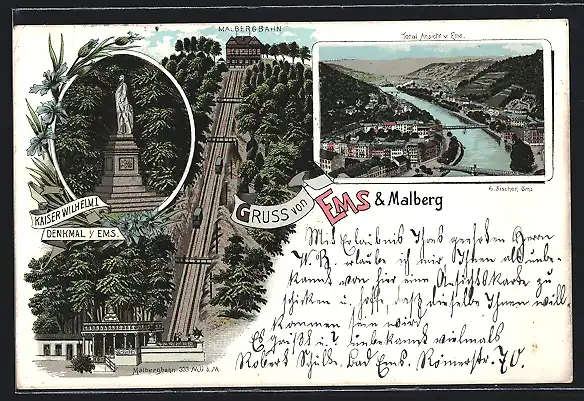 Lithographie Ems, Malbergbahn, Kaiser Wilhelm I. Denkmal, Totalansicht der Stadt