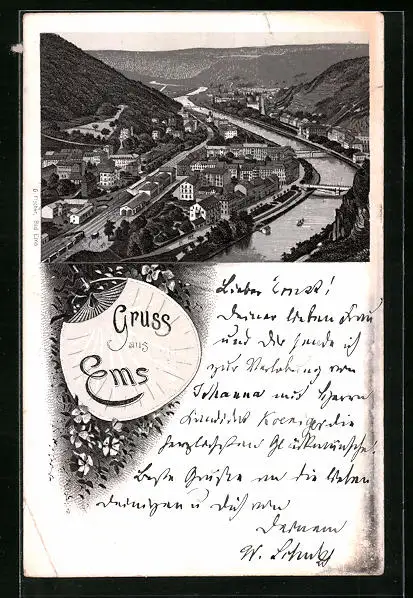 Lithographie Ems, Ortsansicht aus der Vogelschau