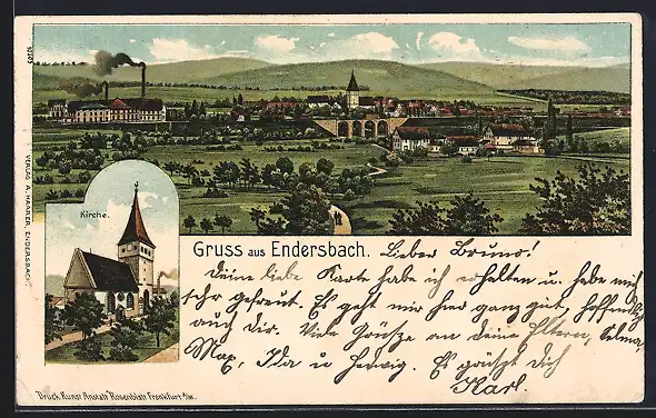 Lithographie Endersbach, Partie an der Kirche, Totalansicht