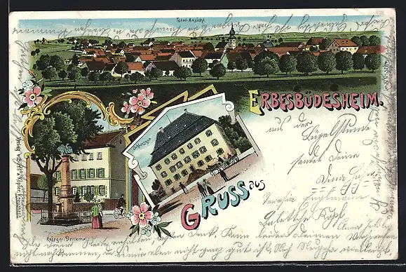 Lithographie Erbesbüdesheim, Totalansicht mit Krieger-Denkmal