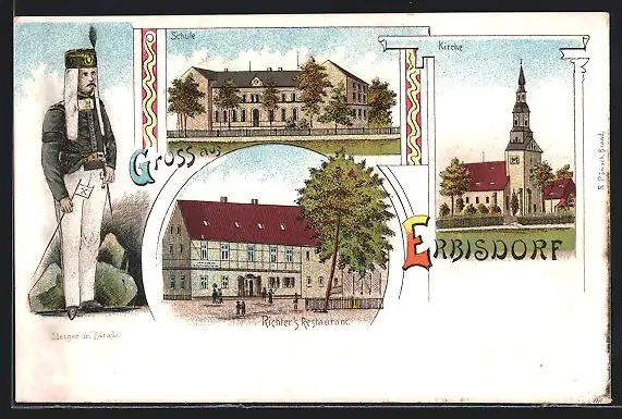 Lithographie Erbisdorf, Richter`s Restaurant, Schule, Steiger in Parade