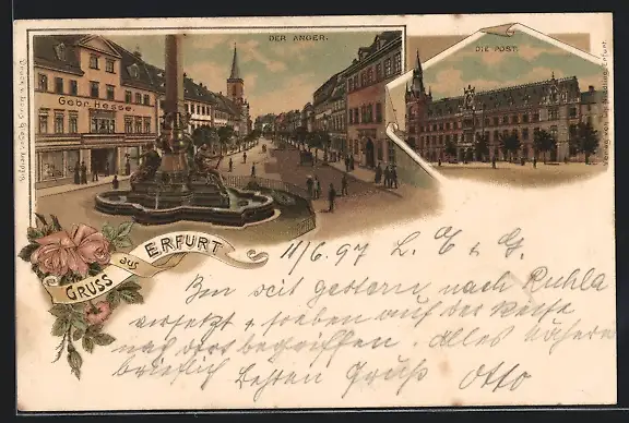 Lithographie Erfurt, Anger mit Geschäftshaus Gebr. Hesse, Post