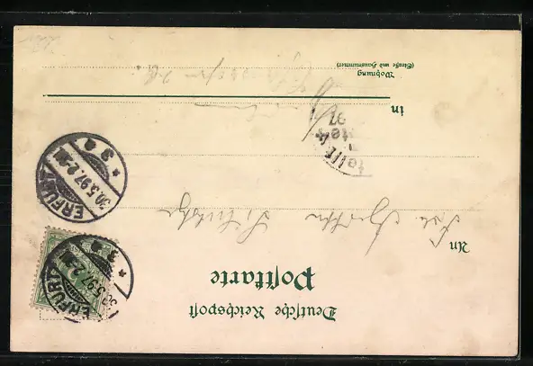 Personenbezogene Daten auf der Rückseite der Karte wurden durch blauen Textmarker unkenntlich gemacht. Die blauen Stellen sind auf die Vorderseite durchgeweicht und wirken sich negativ auf das Postkartenfoto aus