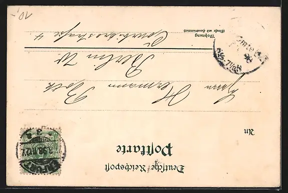 Personenbezogene Daten auf der Rückseite der Karte wurden durch blauen Textmarker unkenntlich gemacht. Die blauen Stellen sind auf die Vorderseite durchgeweicht und wirken sich negativ auf das Postkartenfoto aus