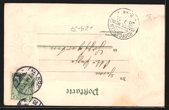 Personenbezogene Daten auf der Rückseite der Karte wurden durch blauen Textmarker unkenntlich gemacht. Die blauen Stellen sind auf die Vorderseite durchgeweicht und wirken sich negativ auf das Postkartenfoto aus