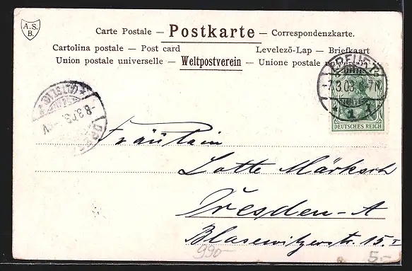 Personenbezogene Daten auf der Rückseite der Karte wurden durch blauen Textmarker unkenntlich gemacht. Die blauen Stellen sind auf die Vorderseite durchgeweicht und wirken sich negativ auf das Postkartenfoto aus