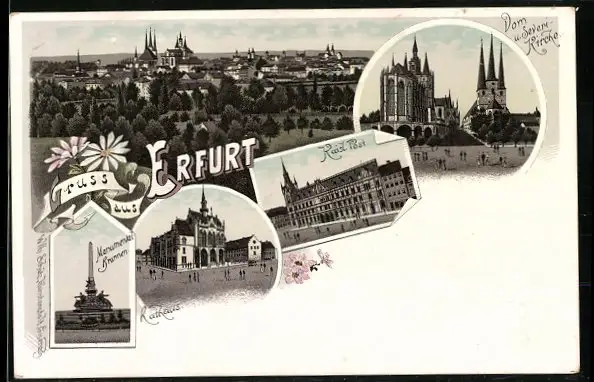 Lithographie Erfurt, Kaisl. Post, Rathaus, Dom u. Severikirche