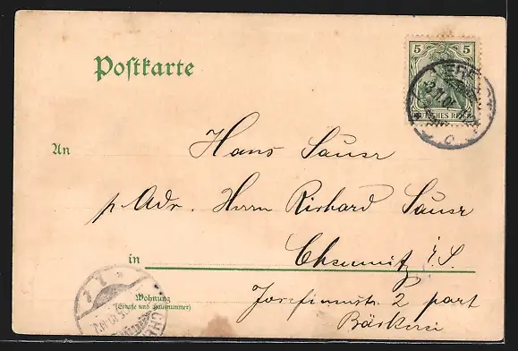 Personenbezogene Daten auf der Rückseite der Karte wurden durch blauen Textmarker unkenntlich gemacht. Die blauen Stellen sind auf die Vorderseite durchgeweicht und wirken sich negativ auf das Postkartenfoto aus