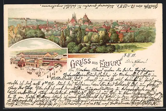 Lithographie Erfurt, Ortsansicht mit Bahnhof