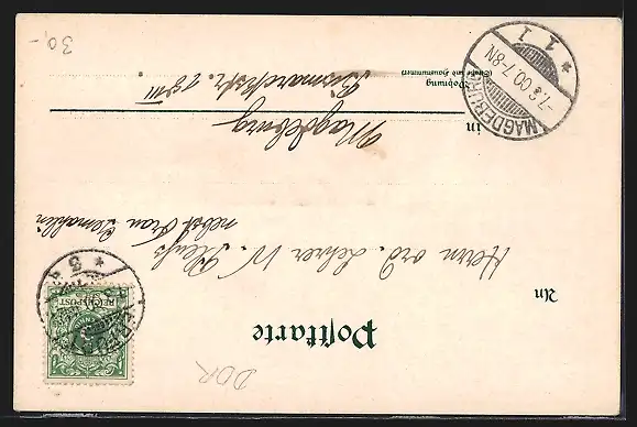 Personenbezogene Daten auf der Rückseite der Karte wurden durch blauen Textmarker unkenntlich gemacht. Die blauen Stellen sind auf die Vorderseite durchgeweicht und wirken sich negativ auf das Postkartenfoto aus