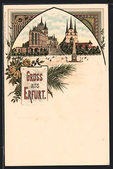 Lithographie Erfurt, Ortspartie mit Denkmal
