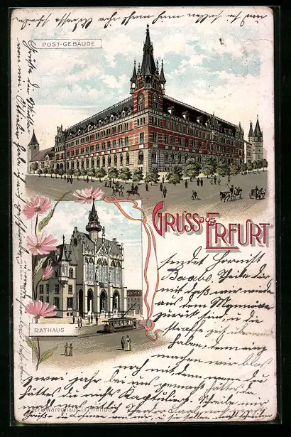 Lithographie Erfurt, Post-Gebäude, Rathaus, Strassenbahn