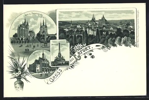 Lithographie Erfurt, Rathaus, Dom und Severinkirche