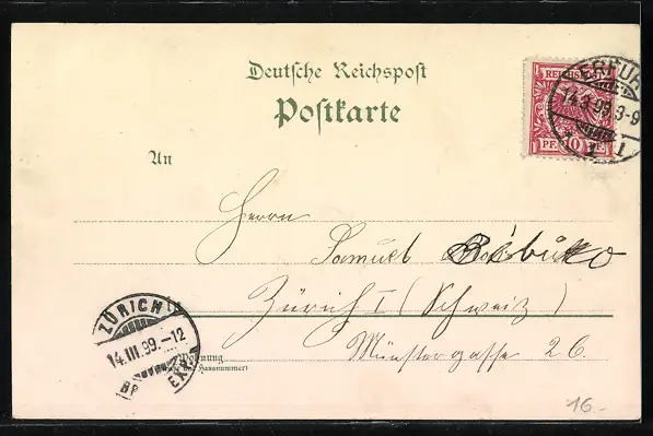 Personenbezogene Daten auf der Rückseite der Karte wurden durch blauen Textmarker unkenntlich gemacht. Die blauen Stellen sind auf die Vorderseite durchgeweicht und wirken sich negativ auf das Postkartenfoto aus