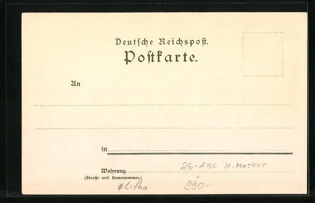 Personenbezogene Daten auf der Rückseite der Karte wurden durch blauen Textmarker unkenntlich gemacht. Die blauen Stellen sind auf die Vorderseite durchgeweicht und wirken sich negativ auf das Postkartenfoto aus
