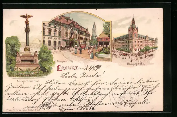 Lithographie Erfurt, Regierung, Hauptpost, Kriegerdenkmal
