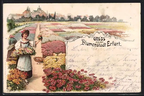 Lithographie Erfurt, Stadtansicht mit Blumenfeldern