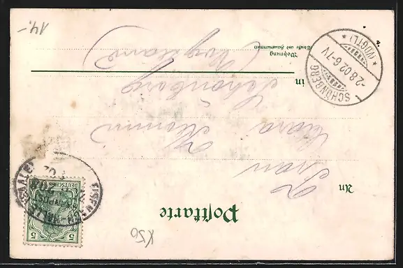 Personenbezogene Daten auf der Rückseite der Karte wurden durch blauen Textmarker unkenntlich gemacht. Die blauen Stellen sind auf die Vorderseite durchgeweicht und wirken sich negativ auf das Postkartenfoto aus