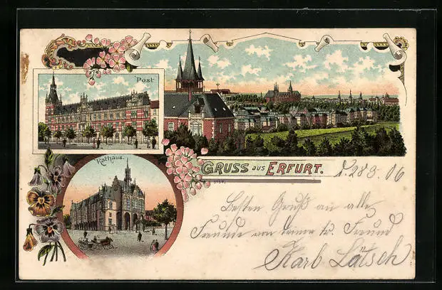 Lithographie Erfurt, Teilansicht, Post, Rathaus