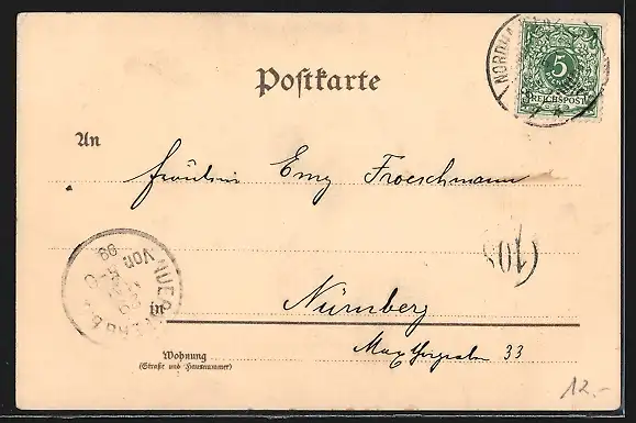 Personenbezogene Daten auf der Rückseite der Karte wurden durch blauen Textmarker unkenntlich gemacht. Die blauen Stellen sind auf die Vorderseite durchgeweicht und wirken sich negativ auf das Postkartenfoto aus