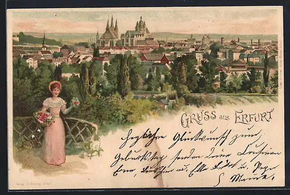 Lithographie Erfurt, Teilansicht und Frau mit Blumen