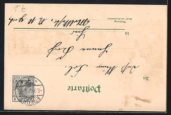 Personenbezogene Daten auf der Rückseite der Karte wurden durch blauen Textmarker unkenntlich gemacht. Die blauen Stellen sind auf die Vorderseite durchgeweicht und wirken sich negativ auf das Postkartenfoto aus