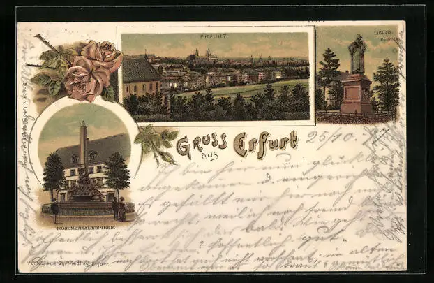 Lithographie Erfurt, Totalansicht mit Monumentalbrunnen