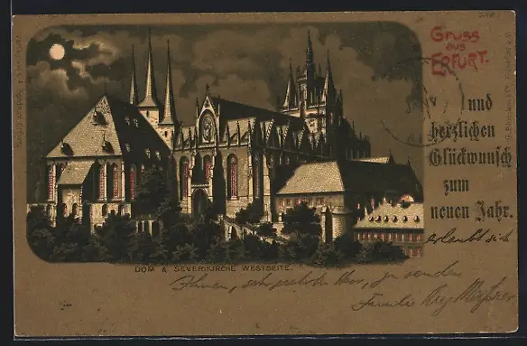Lithographie Erfurt, Westseite von Dom und Severikirche