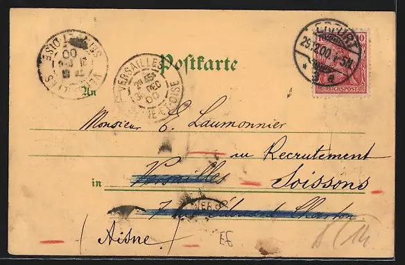Personenbezogene Daten auf der Rückseite der Karte wurden durch blauen Textmarker unkenntlich gemacht. Die blauen Stellen sind auf die Vorderseite durchgeweicht und wirken sich negativ auf das Postkartenfoto aus