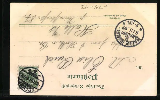 Personenbezogene Daten auf der Rückseite der Karte wurden durch blauen Textmarker unkenntlich gemacht. Die blauen Stellen sind auf die Vorderseite durchgeweicht und wirken sich negativ auf das Postkartenfoto aus