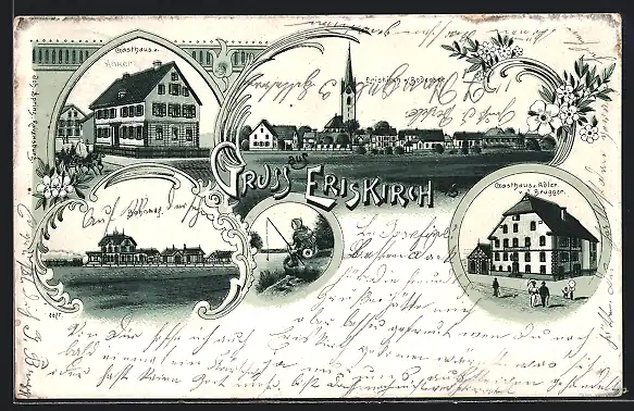 Lithographie Eriskirch a. B., Gasthaus z. Adler v. J. Brugger, Bahnhof, Gasthaus z. Anker