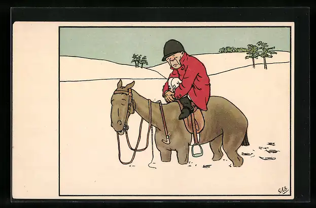 Lithographie Ermüdeter Reiter auf seinem Pferd im Schnee, Karikatur