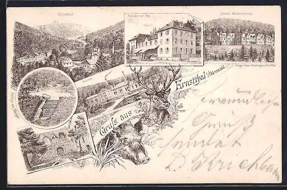 Lithographie Ernstthal i. Odenwald, Gasthaus zur Post, Brauerei, Schloss Waldleiningen