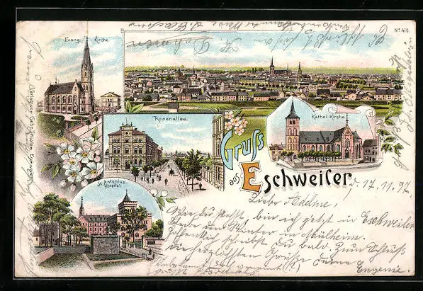 Lithographie Eschweiler, Rosenallee, Kirche, Panorama