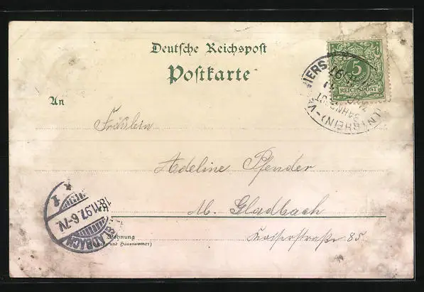 Personenbezogene Daten auf der Rückseite der Karte wurden durch blauen Textmarker unkenntlich gemacht. Die blauen Stellen sind auf die Vorderseite durchgeweicht und wirken sich negativ auf das Postkartenfoto aus