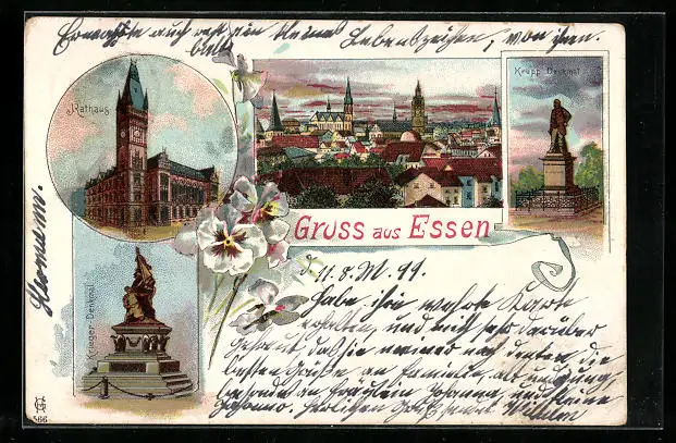 Lithographie Essen, Rathaus, Krieger-Denkmal, Krupp-Denkmal