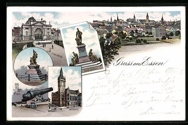 Lithographie Essen /Ruhr, Gesamtansicht, Krupp-Denkmal, Stadttheater, Rathhaus