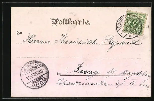 Personenbezogene Daten auf der Rückseite der Karte wurden durch blauen Textmarker unkenntlich gemacht. Die blauen Stellen sind auf die Vorderseite durchgeweicht und wirken sich negativ auf das Postkartenfoto aus
