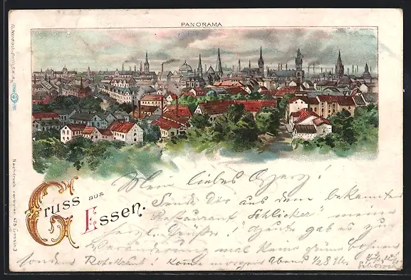 Lithographie Essen / Ruhr, Panorama der Ortschaft