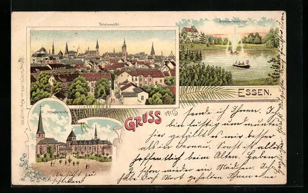 Lithographie Essen /Ruhr, Totalansicht, Stadtgartenpartie, Münsterkirche