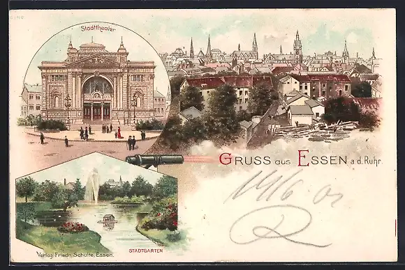 Lithographie Essen a. d. Ruhr, Panorama, Stadttheater und Stadtgarten