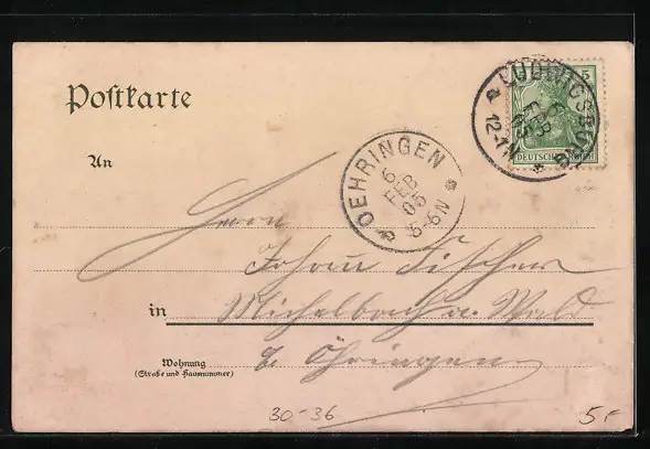 Personenbezogene Daten auf der Rückseite der Karte wurden durch blauen Textmarker unkenntlich gemacht. Die blauen Stellen sind auf die Vorderseite durchgeweicht und wirken sich negativ auf das Postkartenfoto aus